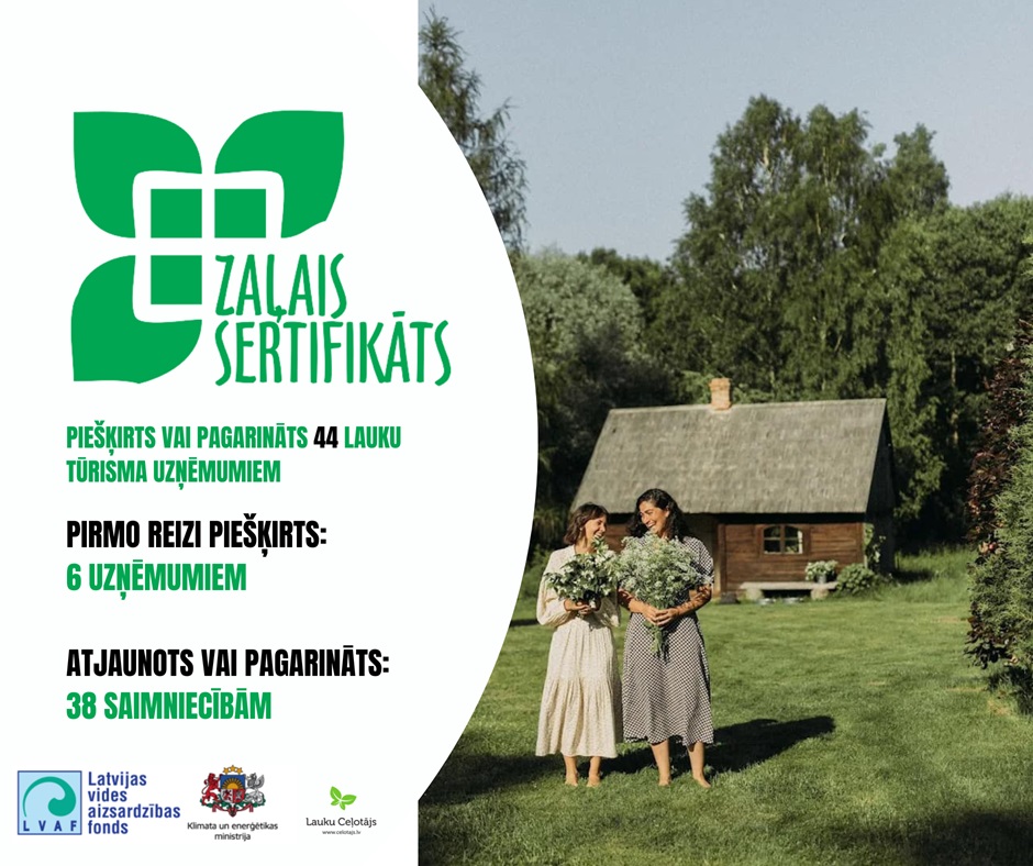 Zaļais sertifikāts ir vides kvalitātes zīme tūrisma uzņēmumiem laukos - naktsmītnēm, ēdināšanas vietām un ražojošām saimniecībām, kas uzņem apmeklētājus. 114 zaļi domājoši tūrisma uzņēmumi Latvijā saimnieko videi draudzīgi un piedāvā lielisku atpūtu saviem viesiem, kuriem svarīgas zaļās izvēles.